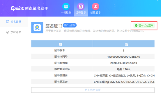 如果“證書(shū)檢測(cè)結(jié)果”中顯示證書(shū)狀態(tài)正常,則表示您的證書(shū)Key是可以正常使用的,如下圖: