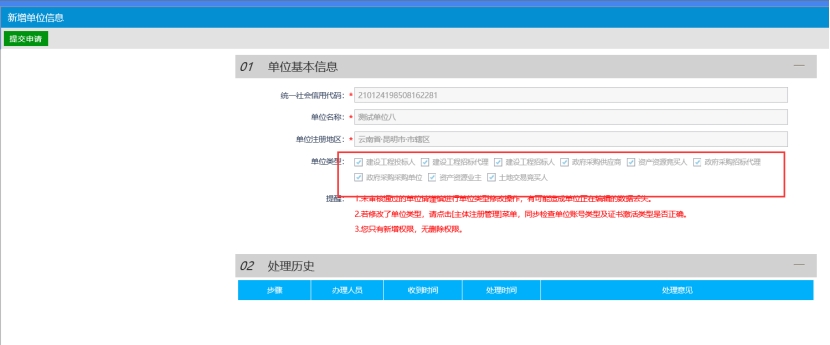 2、在身份新增頁(yè)面,勾選需要增加的身份類型(注意此處已申請(qǐng)的身份無(wú)法刪除),完成點(diǎn)擊左上角的“提交申請(qǐng)”,等省交易中心審核通過(guò)即可: