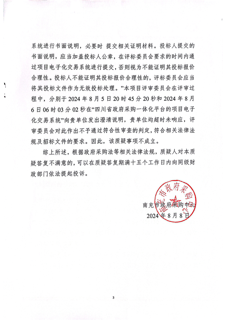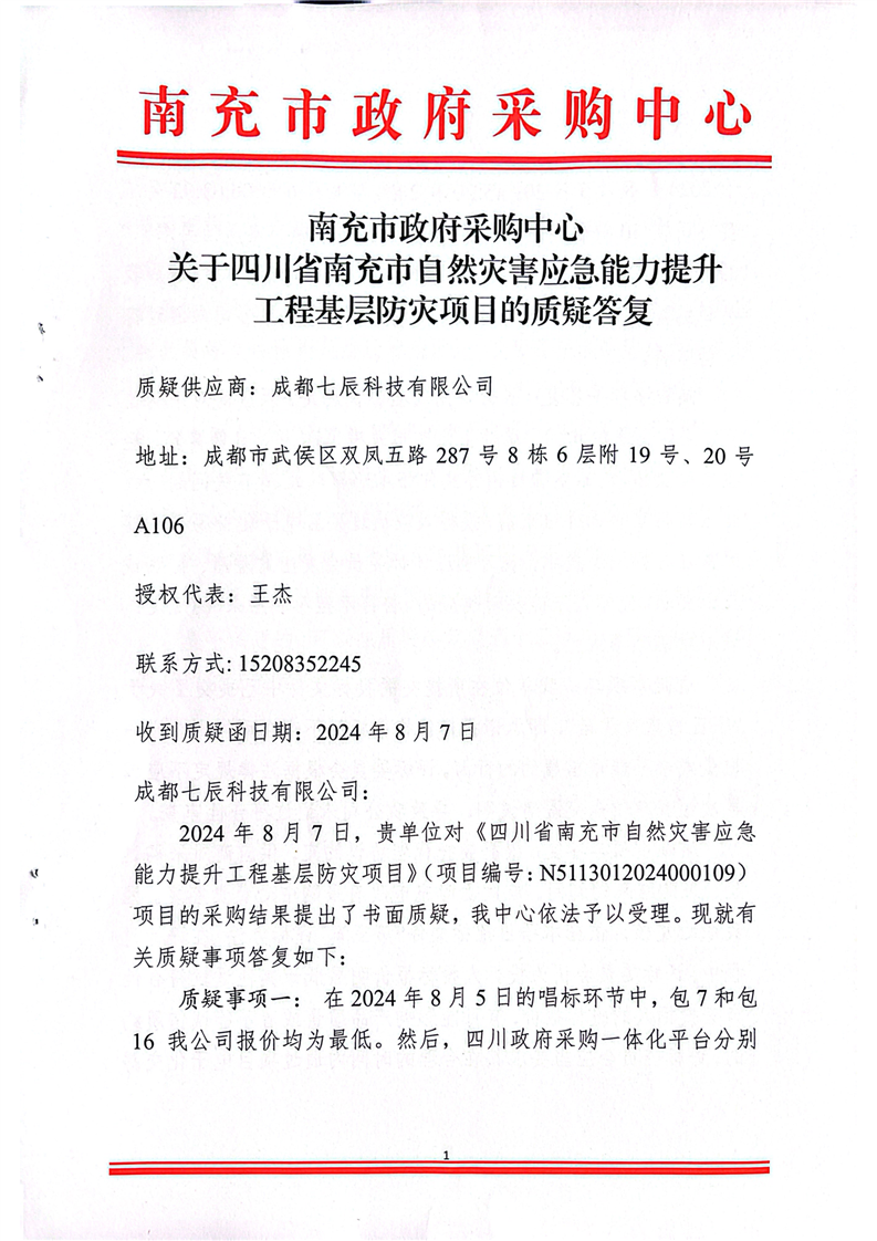 南充市政府采購(gòu)中心關(guān)于四川省南充市自然災(zāi)害應(yīng)急能力提升工程基層防災(zāi)項(xiàng)目的質(zhì)疑答復(fù)