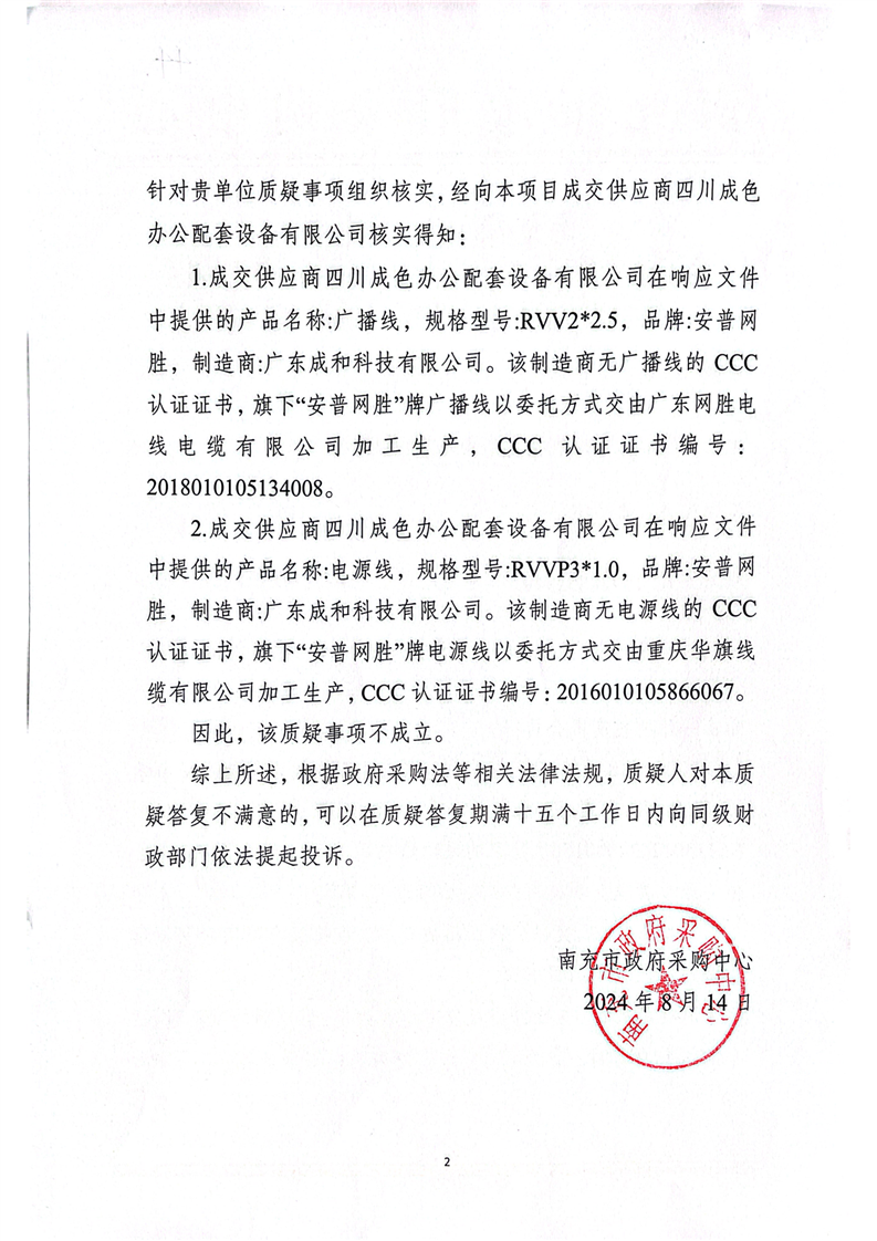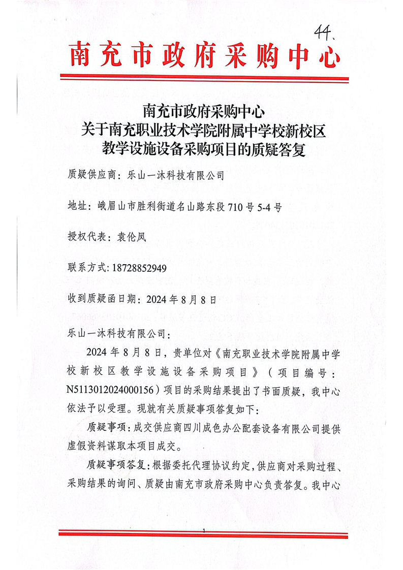 南充市政府采購中心關(guān)于南充職業(yè)技術(shù)學(xué)院附屬中學(xué)校新校區(qū)教學(xué)設(shè)施設(shè)備采購項(xiàng)目的質(zhì)疑答復(fù)(樂山一沐科技有限公司)