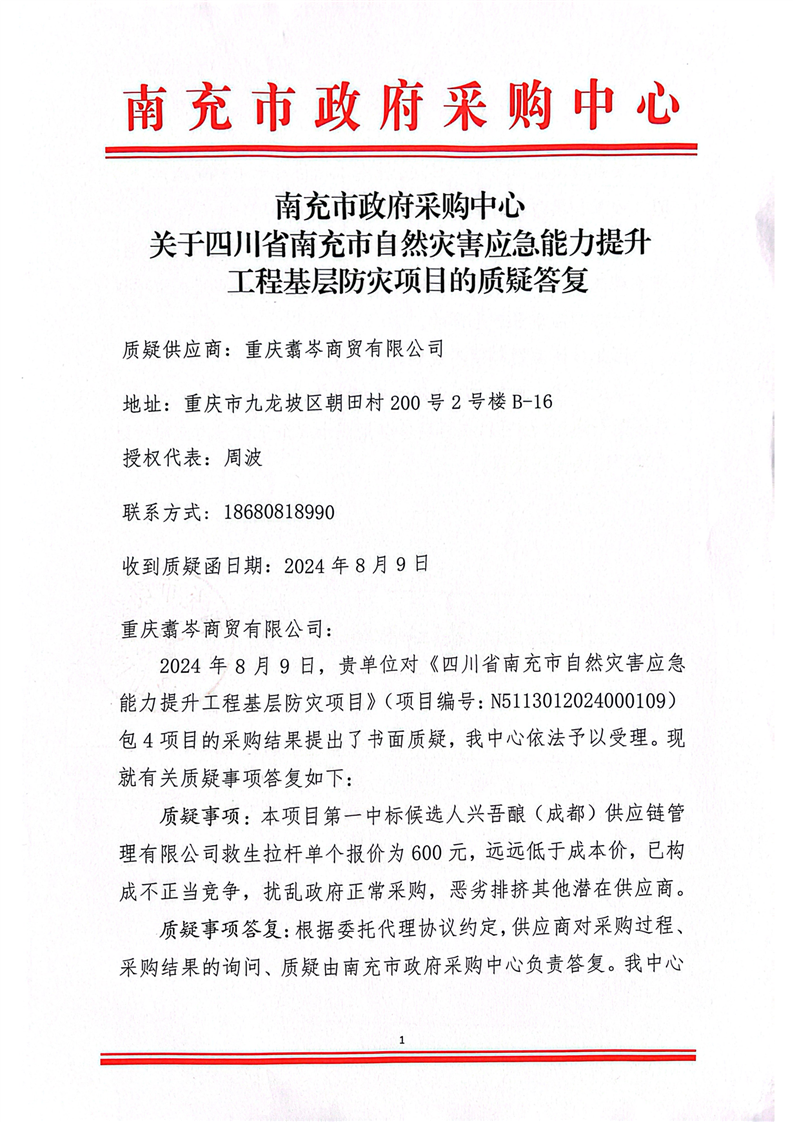 南充市政府采購中心關于四川省南充市自然災害應急能力提升工程基層防災項目的質疑答復(重慶翥岑商貿(mào)有限公司)