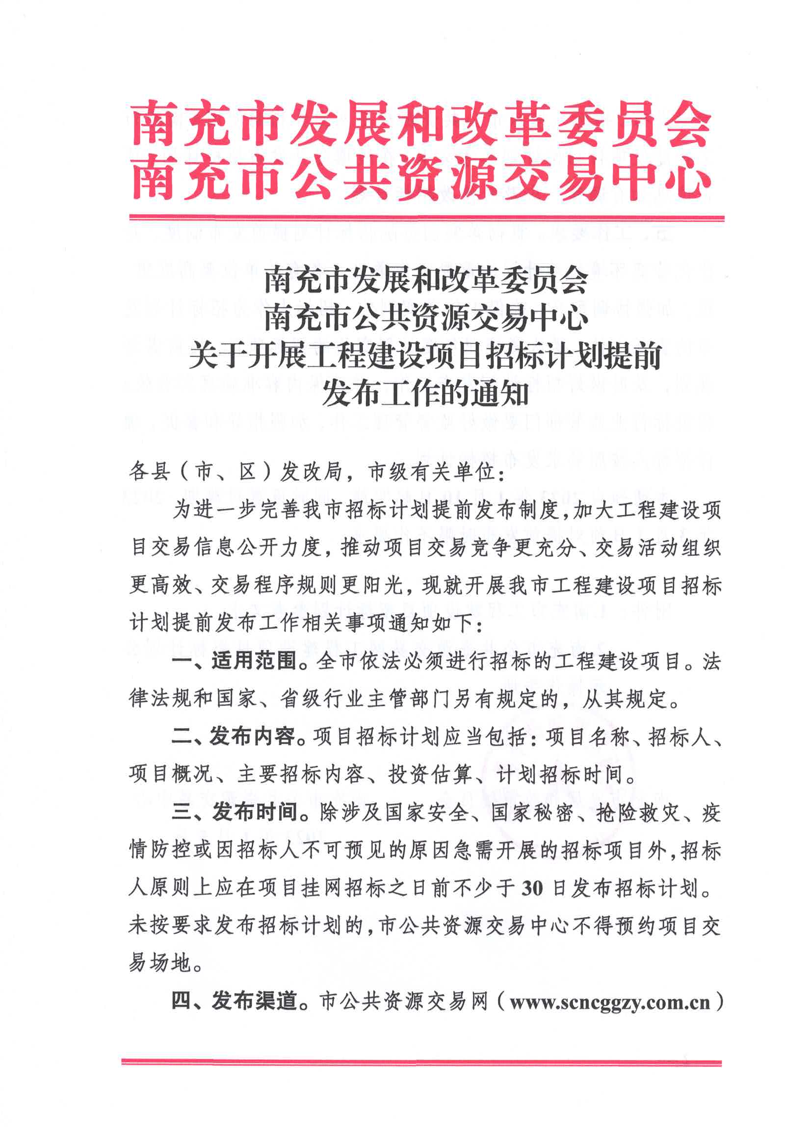 南充市發(fā)展和改革委員會(huì)、南充市公共資源交易中心關(guān)于開(kāi)展工程建設(shè)項(xiàng)目招標(biāo)計(jì)劃提前發(fā)布工作的通知