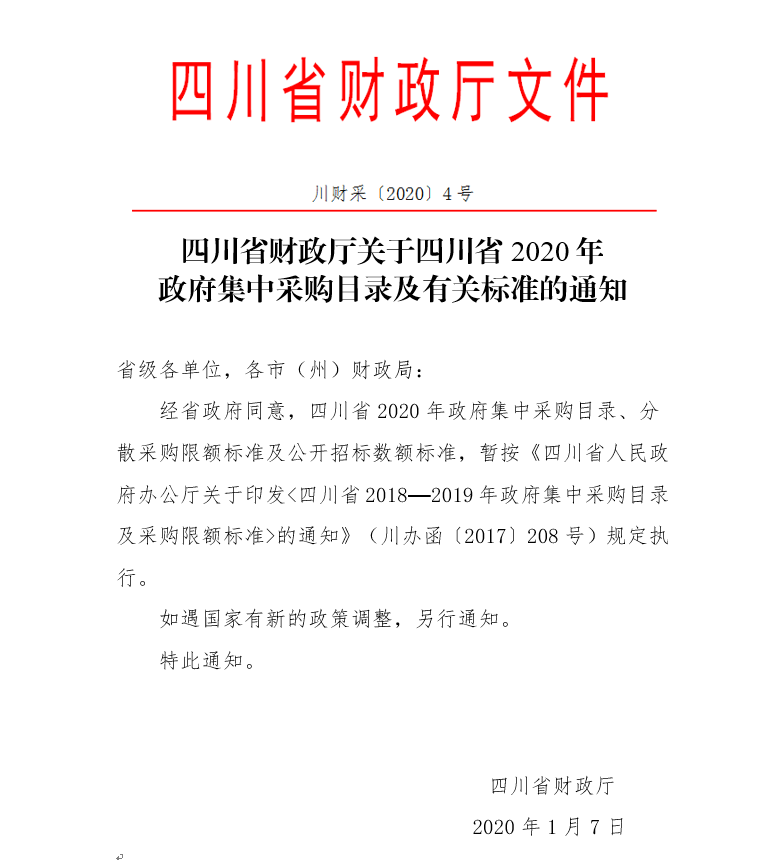四川省財政廳關于四川省2020年政府集中采購目錄及有關標準的通知