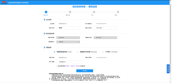 (注:申請(qǐng)保單過程中如遇特殊情況退出頁面,可通過點(diǎn)擊繳納保證金頁面的保單申請(qǐng)重新進(jìn)入,系統(tǒng)自動(dòng)跳轉(zhuǎn)至上一步未完成頁面)