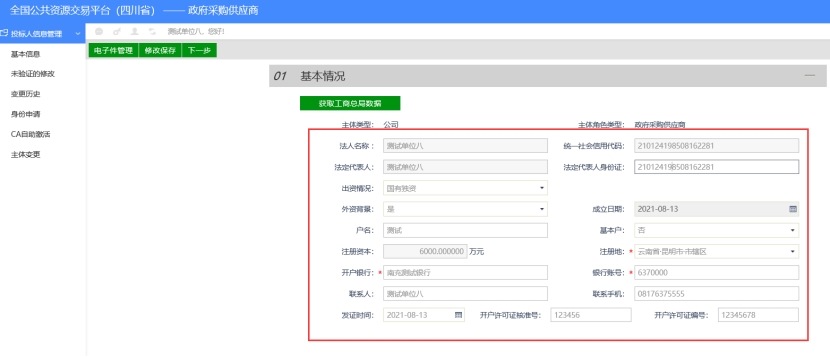 3、完成后點(diǎn)擊“下一步”,進(jìn)入頁(yè)面最后點(diǎn)擊“提交信息”,等省交易中心審核通過(guò)后即可: