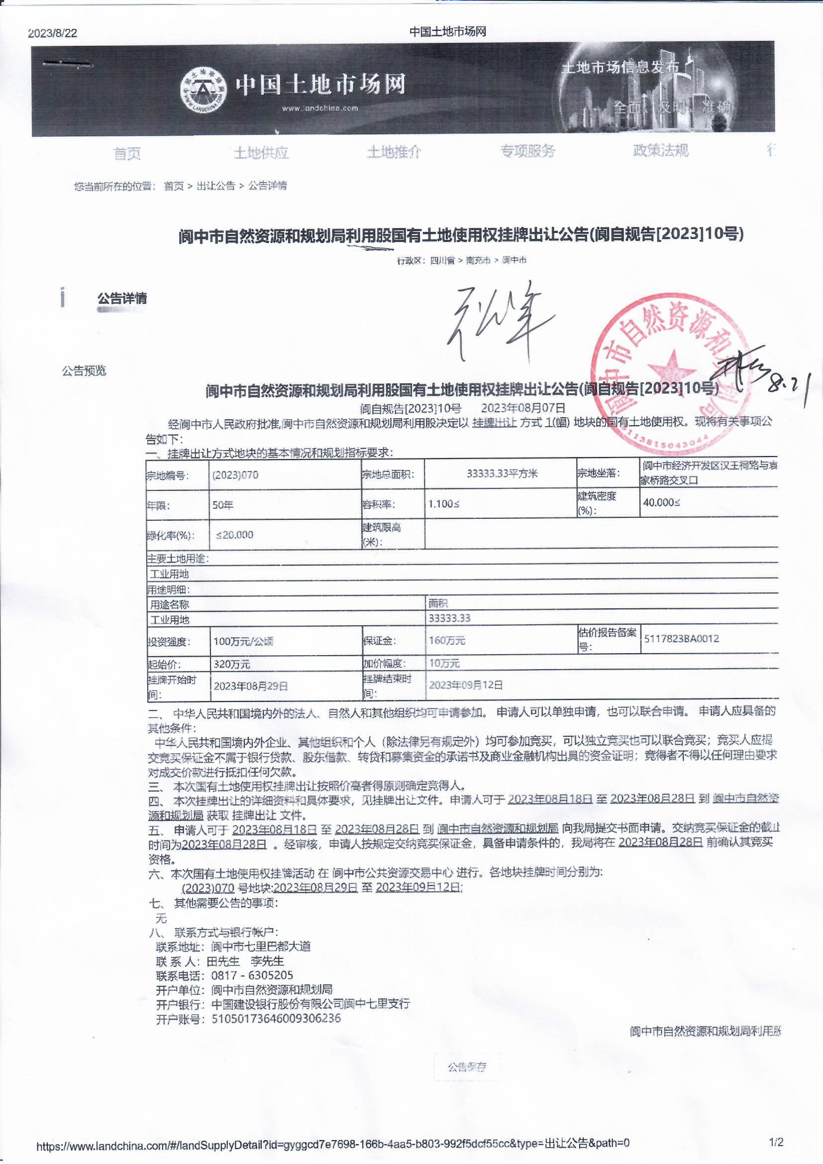 閬中市自然資源和規(guī)劃局利用股國有土地使用權(quán)掛牌出讓公告(閬自規(guī)告[2023]10號)