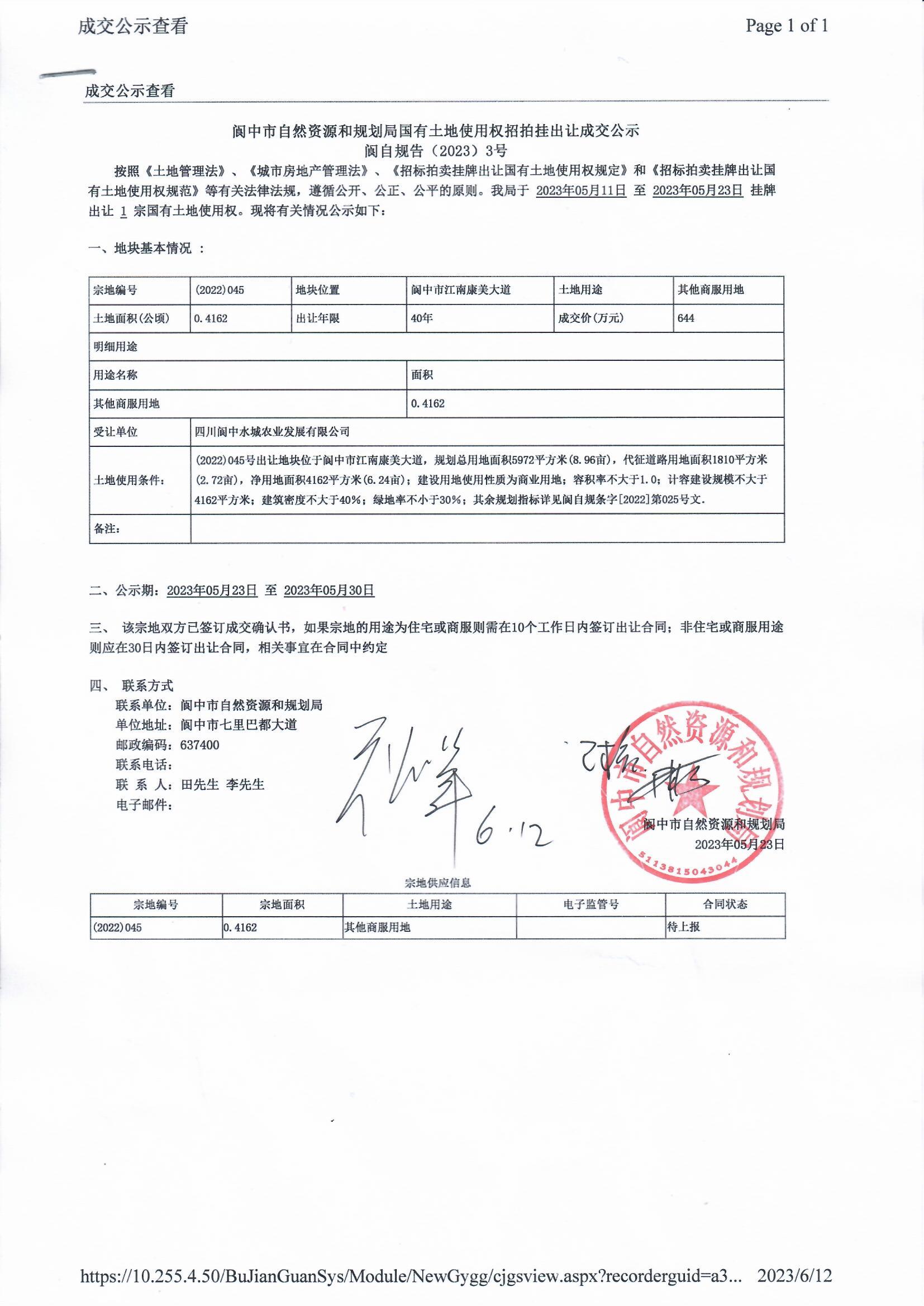 閬中市自然資源和規(guī)劃局國有土地使用權(quán)招拍掛出讓成交公示(閬?zhàn)砸?guī)告[2023]03號(hào))