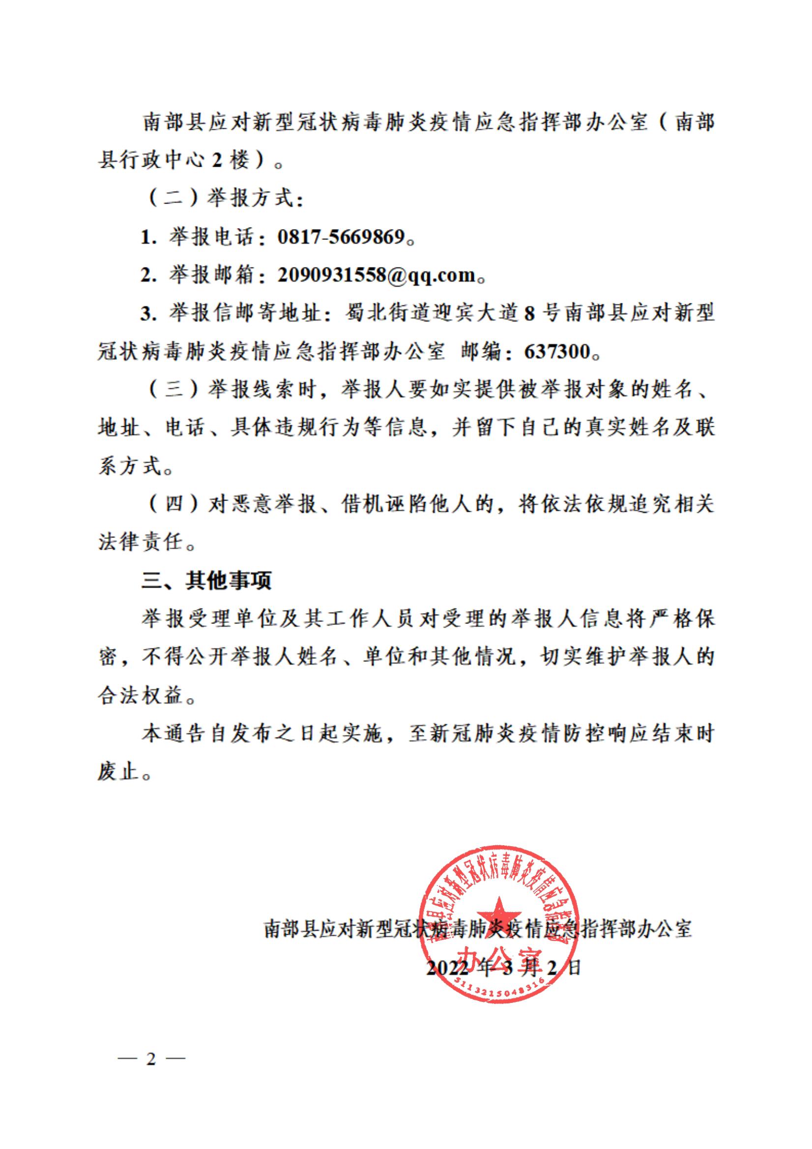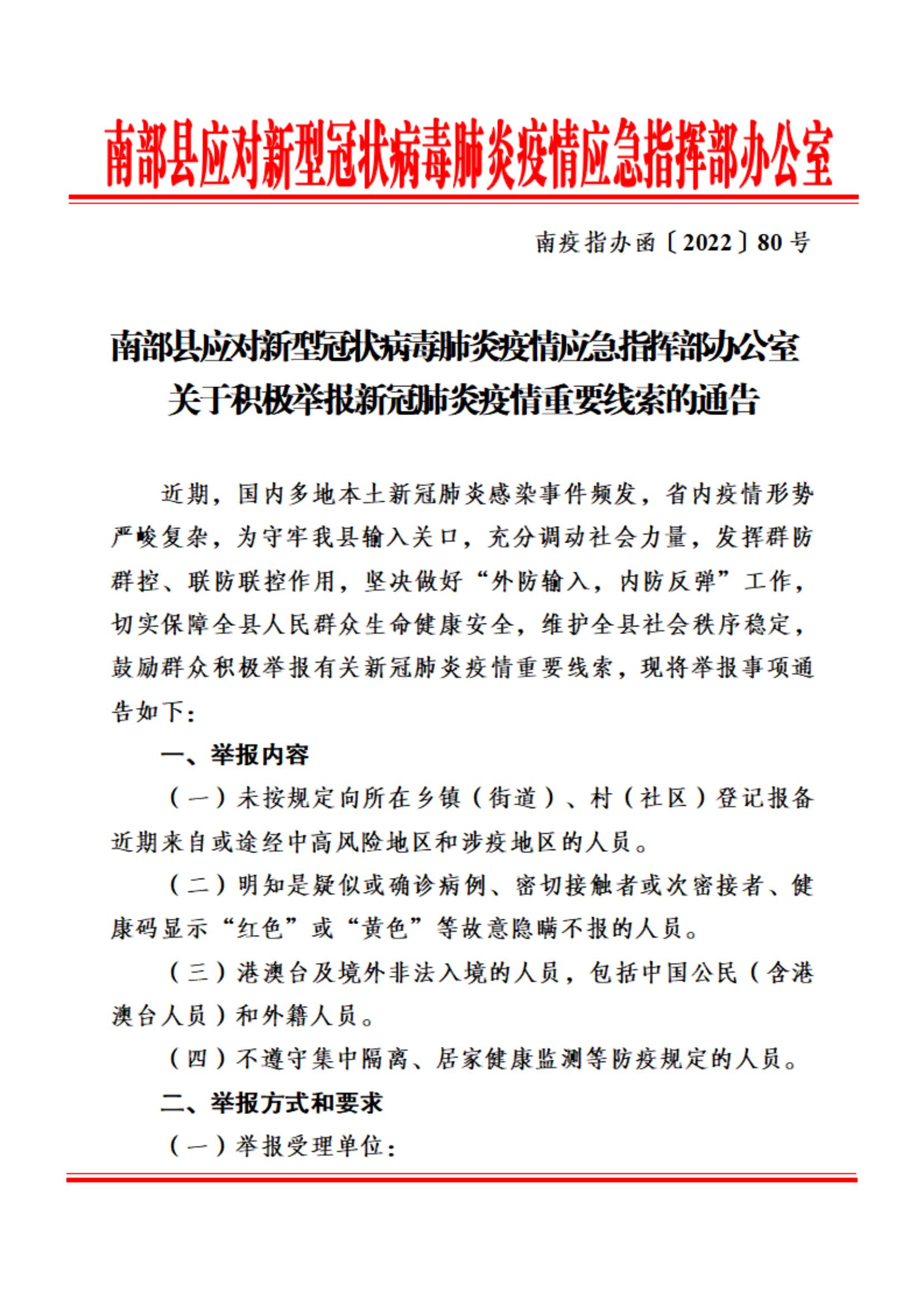 南部縣關于積極舉報新冠肺炎疫情重要線索的通告