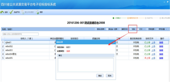 注:如遇特殊情況,需要投標(biāo)人現(xiàn)場(chǎng)遞交投標(biāo)文件,請(qǐng)?jiān)陂_(kāi)標(biāo)一欄表中選擇該投標(biāo)人,然后上傳文件。