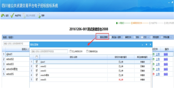 點(diǎn)擊“報(bào)名記錄表”,可以查看當(dāng)前標(biāo)段有哪些投標(biāo)人參與了報(bào)名,這里上傳投標(biāo)文件的會(huì)默認(rèn)加入到“開(kāi)標(biāo)記錄表”中,其他投標(biāo)人如果需要加入,請(qǐng)?jiān)谠撏稑?biāo)人前面打鉤,然后點(diǎn)擊“加入到開(kāi)標(biāo)記錄表”;