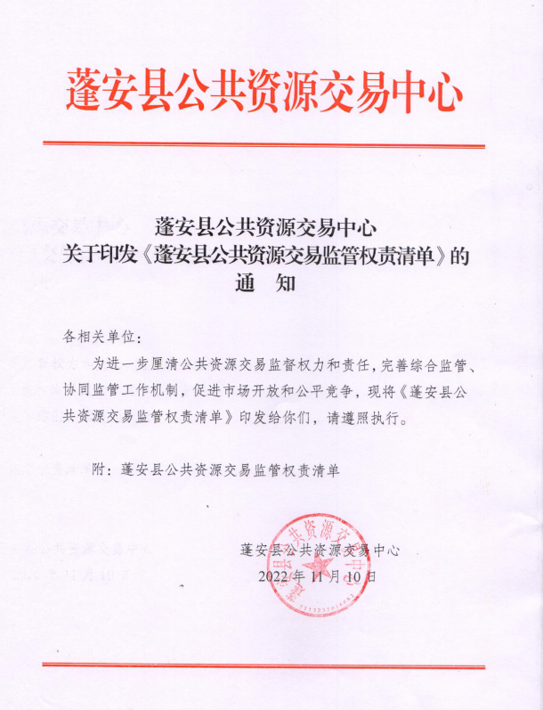 蓬安縣公共資源交易中心關(guān)于印發(fā)《蓬安縣公共資源交易監(jiān)管權(quán)責(zé)清單》的通知